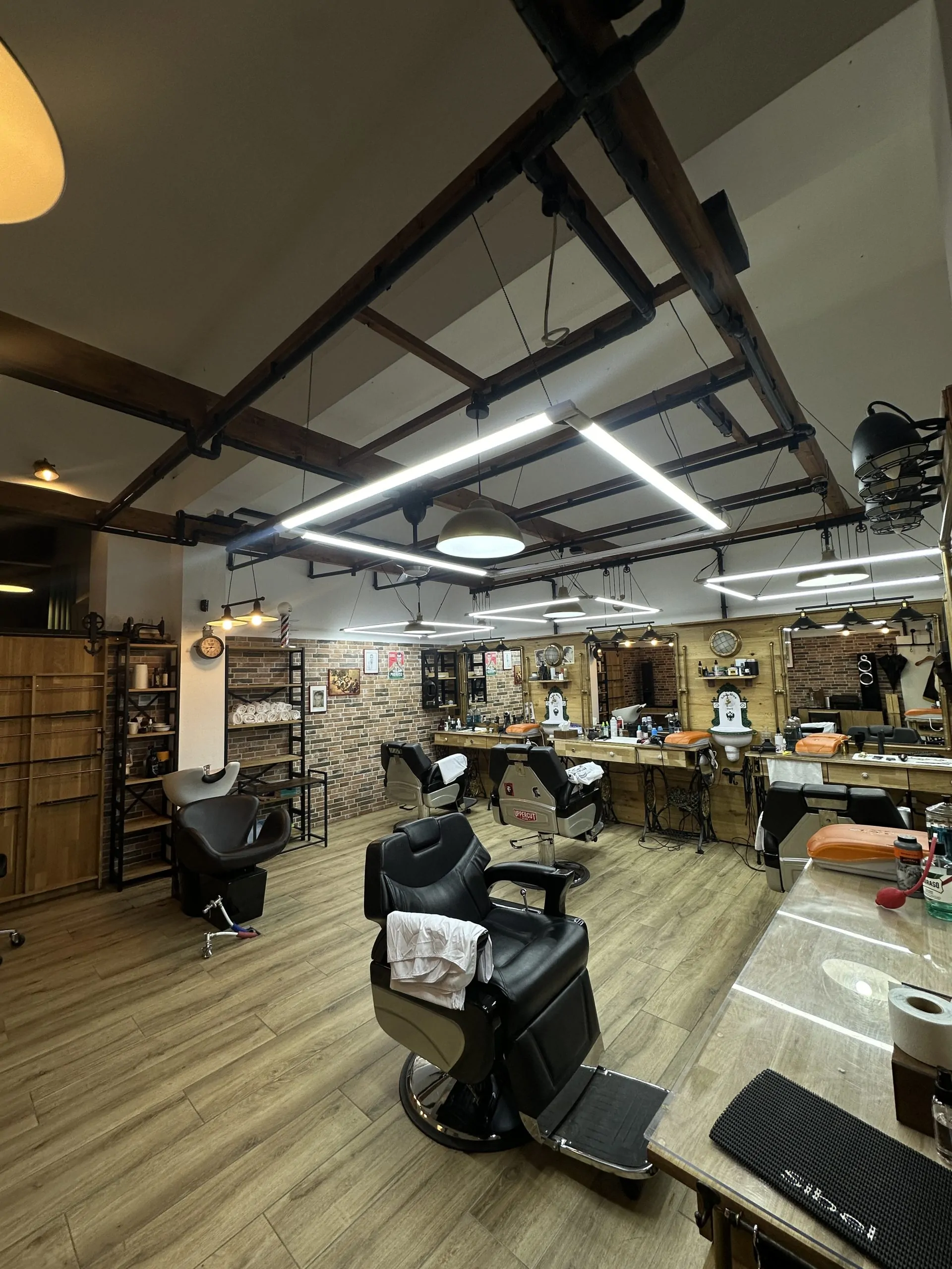 The interior of the hair salon is designed in a barbershop style. A lot of natural wood and metal has been used in the decor. Some of the walls are made of imitation brick, there are wooden beams under the ceiling and an open ventilation and lighting system. Various decorative elements such as themed photographs, portraits, etc. add to the atmosphere of the place.